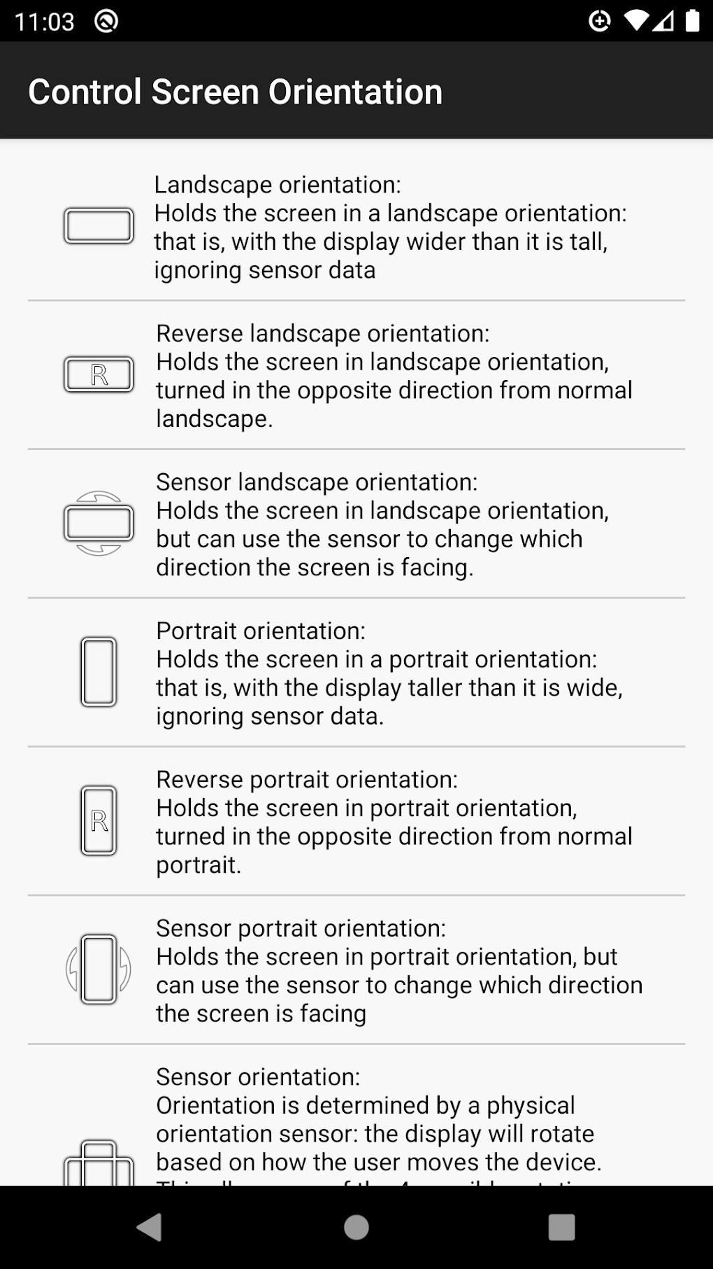Sensor-based Landscape: Similar to sensor-based portrait, this mode utilizes the orientation sensor but only allows switching within landscape orientation. The screen will remain in landscape, unless rotated 180 degrees from its initial position.