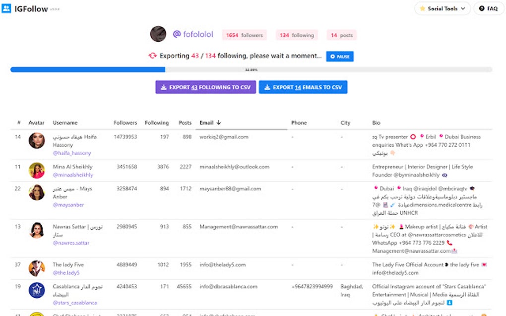 Beyond the basic follower/following export, IGFollow offers a more comprehensive data extraction option. Users can opt to include detailed user profiles in their export. This enhanced export includes a wealth of information for each user, such as their follower count, following count, biography, and, if publicly available, their email address. This detailed information provides a richer dataset for more in-depth analysis and targeted marketing efforts. It’s important to note, however, that exporting user profiles significantly increases the processing time required, as the extension must individually request and retrieve data for each user in the list.