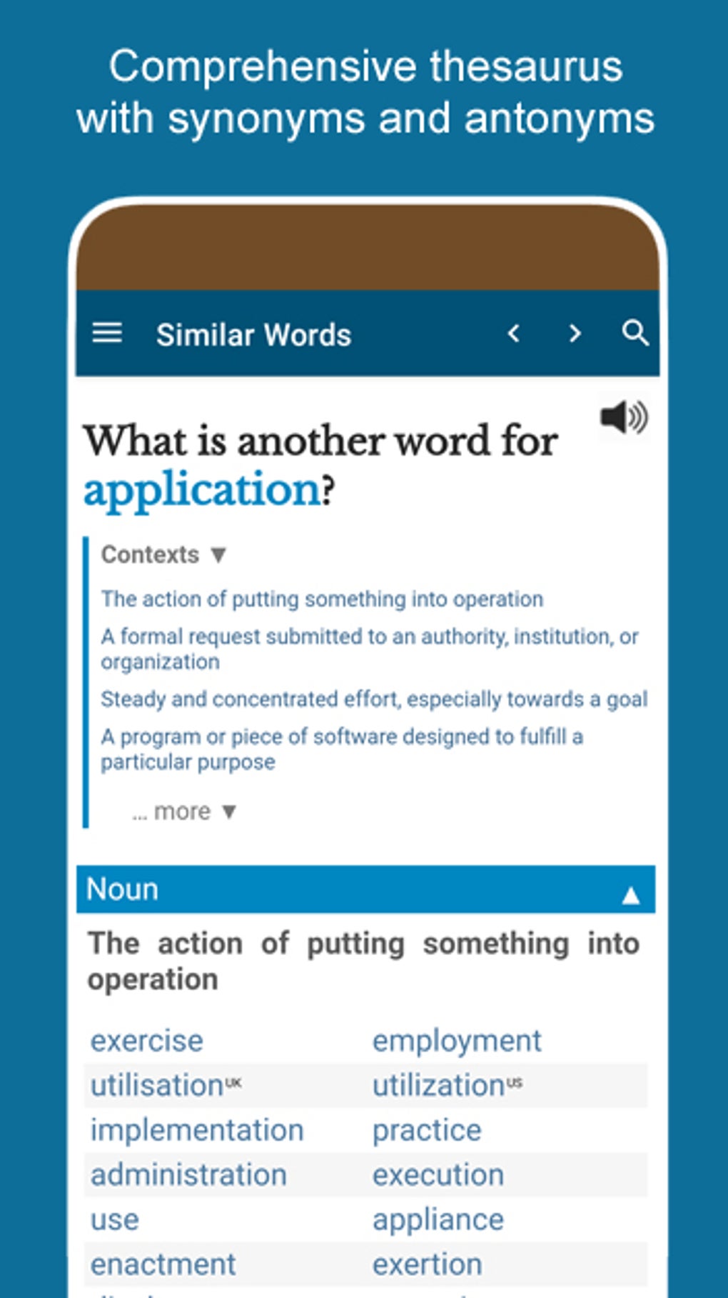 The app’s ability to provide synonyms, antonyms, and definitions makes it invaluable for expanding vocabulary and understanding context. This facilitates a deeper understanding of language and helps students to express themselves more precisely and effectively. The app’s offline functionality is also advantageous for educational settings, ensuring access to resources even without a consistent internet connection. For students, this is especially helpful for independent study or in areas with limited connectivity.